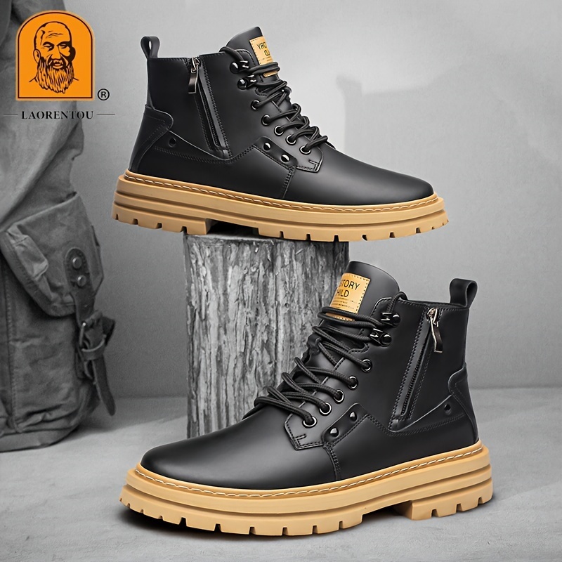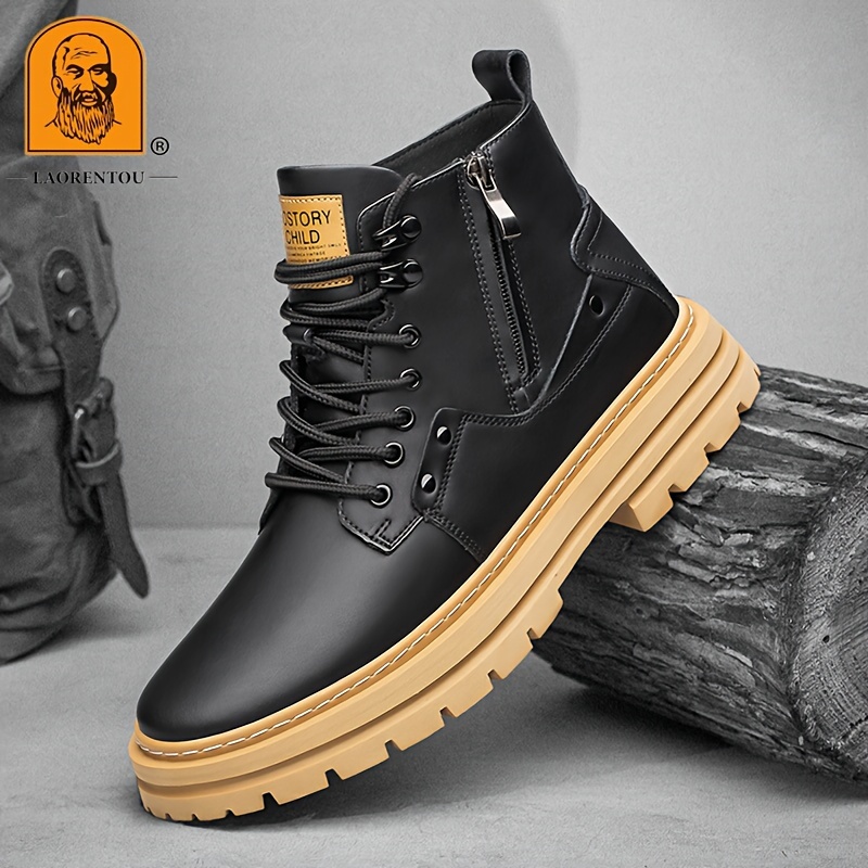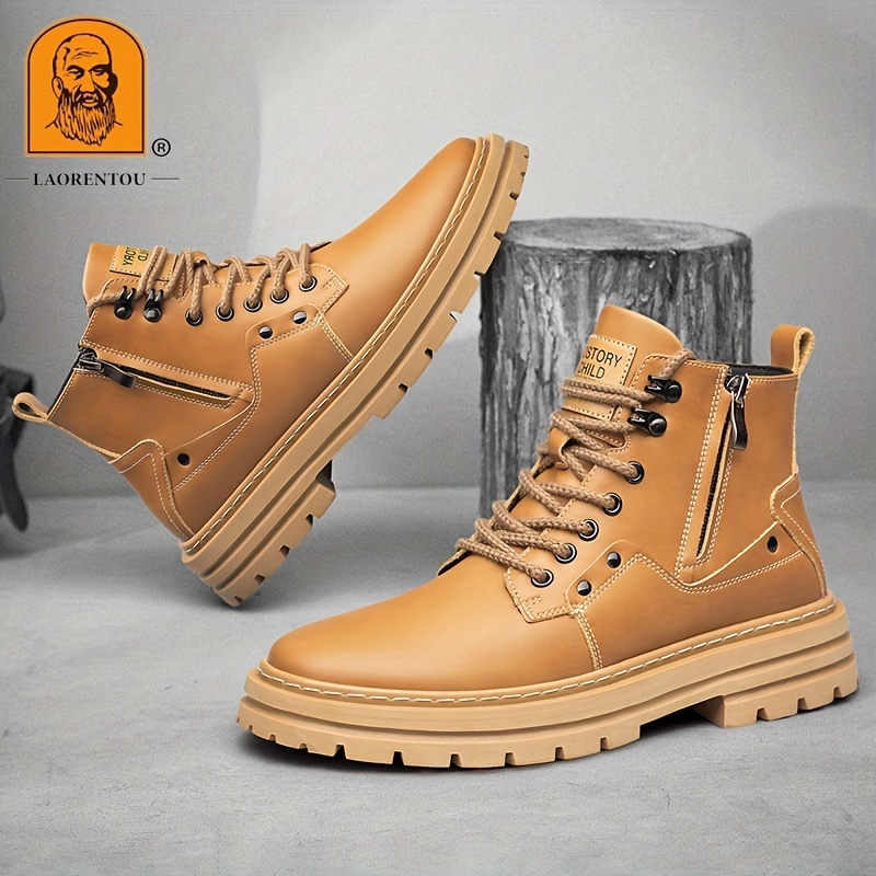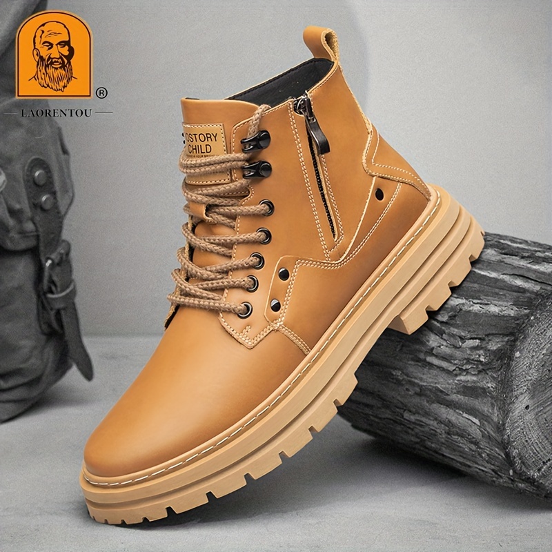 Men's Trendy Outdoor Work Boots, Breathable Anti-skid High-top Lace-up Boots With Side Zipper, Autumn And Winter