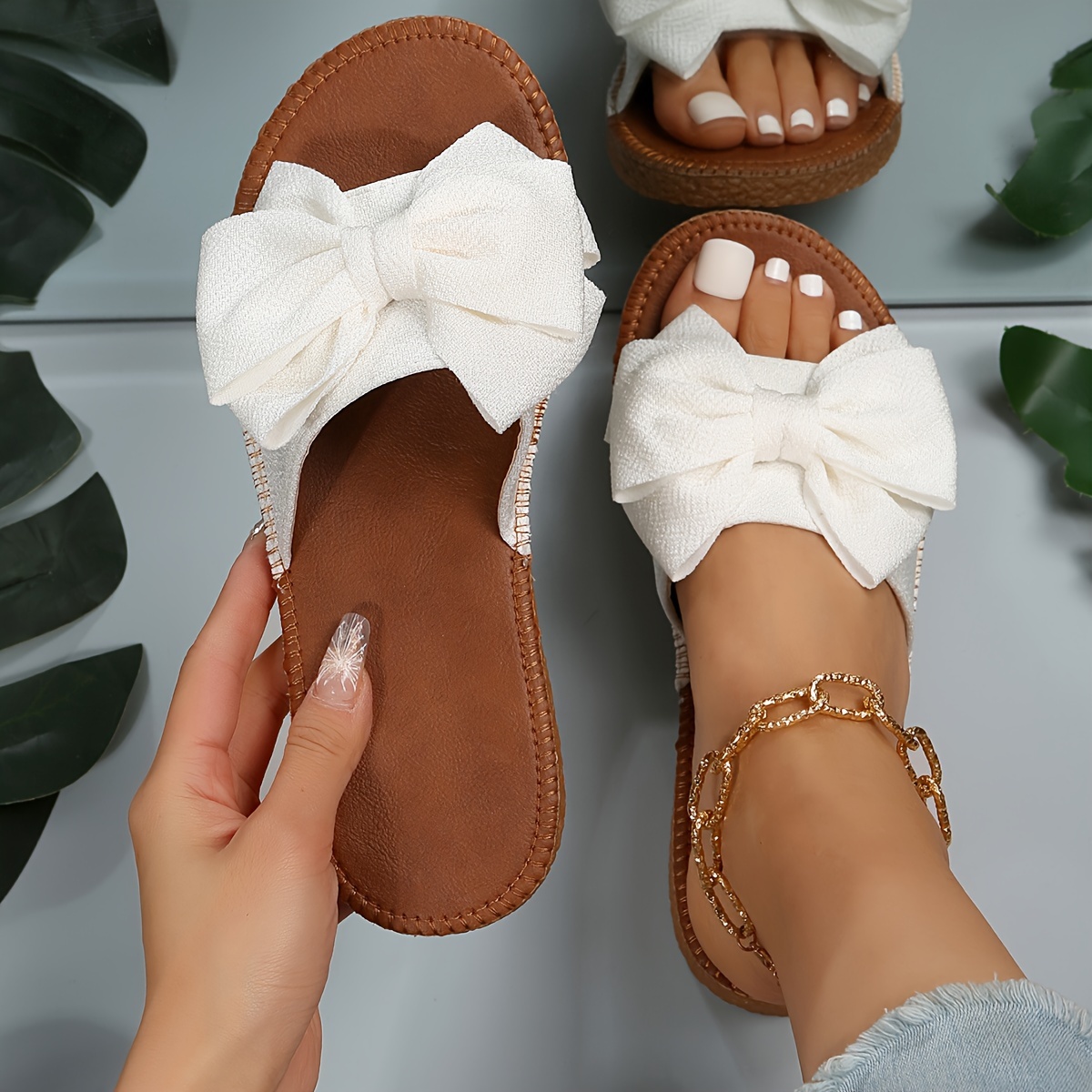 Women's Solid Color Sandals, Bowknot Decor Flat Non-slip Slides Shoes, Summer Vacation Beach Shoes